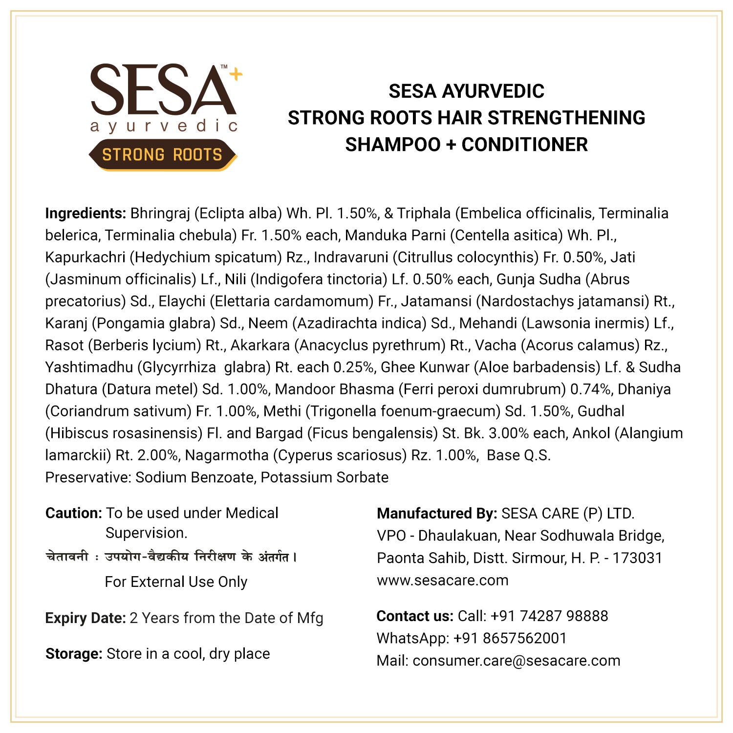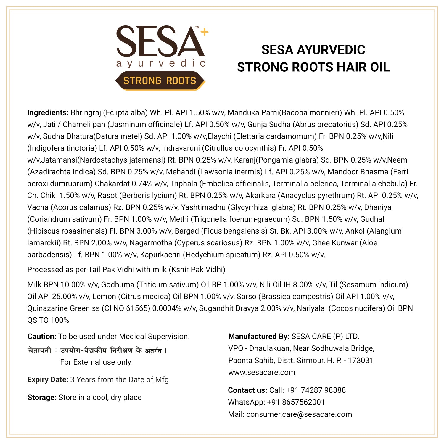 Ayurvedic Strong Roots Hair Oil- Bhringraj (Eclipta alba) Wh. Pl. API 1.50% w/v, Manduka Parni(Bacopa monnieri) Wh. Pl. API 0.50% w/v, Jati / Chameli pan (Jasminum officinale) Lf. API 0.50% w/v, Gunja Sudha (Abrus precatorius) Sd. API 0.25% w/v, Sudha Dhatura(Datura metel) Sd. API 1.00% w/v,Elaychi (Elettaria cardamomum) Fr. BPN 0.25% w/v,Nili (Indigofera tinctoria) Lf. API 0.50% w/v, Indravaruni (Citrullus colocynthis) Fr. API 0.50% w/v,Jatamansi(Nardostachys jatamansi) Rt. BPN 0.25% w/v, Karanj(Pongamia glabra) Sd. BPN 0.25% w/v,Neem (Azadirachta indica) Sd. BPN 0.25% w/v, Mehandi (Lawsonia inermis) Lf. API 0.25% w/v, Mandoor Bhasma (Ferri peroxi dumrubrum) Chakardat 0.74% w/v, Triphala (Embelica officinalis, Terminalia belerica, Terminalia chebula) Fr. Ch. Chik 1.50% w/v, Rasot (Berberis lycium) Rt. BPN 0.25% w/v, Akarkara (Anacyclus pyrethrum) Rt. API 0.25% w/v, Vacha (Acorus calamus) Rz. BPN 0.25% w/v, Yashtimadhu (Glycyrrhiza glabra) Rt. BPN 0.25% w/v, Dhaniya (Coriandrum sativum) Fr. BPN 1.00% w/v, Methi (Trigonella foenum-graecum) Sd. BPN 1.50% w/v, Gudhal (Hibiscus rosasinensis) Fl. BPN 3.00% w/v, Bargad (Ficus bengalensis) St. Bk. API 3.00% w/v, Ankol (Alangium lamarckii) Rt. BPN 2.00% w/v, Nagarmotha (Cyperus scariosus) Rz. BPN 1.00% w/v, Ghee Kunwar (Aloe barbadensis) Lf. BPN 1.00% w/v, Kapurkachri (Hedychium spicatum) Rz. API 0.50% w/v. Processed as per Tail Pak Vidhi with milk (Kshir Pak Vidhi) Milk BPN 10.00% v/v, Godhuma (Triticum sativum) Oil BP 1.00% v/v, Nili Oil IH 8.00% v/v, Til (Sesamum indicum) Oil API 25.00% v/v, Lemon (Citrus medica) Oil BPN 1.00% v/v, Sarso (Brassica campestris) Oil API 1.00% v/v, Quinazarine Green ss (CI NO 61565) 0.0004% w/v, Sugandhit Dravya 2.00% v/v, Nariyala (Cocos nucifera) Oil BPN QS TO 100% Ayurvedic Strong Roots Conditioning Shampoo- Bhringraj (Eclipta alba) Wh. Pl. 1.50%, & Triphala (Embelica officinalis, Terminalia belerica, Terminalia chebula) Fr. 1.50% each, Manduka Parni (Centella asitica) Wh. Pl., Kapurkachri (Hedychium spicatum) Rz., Indravaruni (Citrullus colocynthis) Fr. 0.50%, Jati (Jasminum officinalis) Lf., Nili (Indigofera tinctoria) Lf. 0.50% each, Gunja Sudha (Abrus precatorius) Sd., Elaychi (Elettaria cardamomum) Fr., Jatamansi (Nardostachys jatamansi) Rt., Karanj (Pongamia glabra) Sd., Neem (Azadirachta indica) Sd., Mehandi (Lawsonia inermis) Lf., Rasot (Berberis lycium) Rt., Akarkara (Anacyclus pyrethrum) Rt., Vacha (Acorus calamus) Rz., Yashtimadhu (Glycyrrhiza glabra) Rt. each 0.25%, Ghee Kunwar (Aloe barbadensis) Lf. & Sudha Dhatura (Datura metel) Sd. 1.00%, Mandoor Bhasma (Ferri peroxi dumrubrum) 0.74%, Dhaniya (Coriandrum sativum) Fr. 1.00%, Methi (Trigonella foenum-graecum) Sd. 1.50%, Gudhal (Hibiscus rosasinensis) Fl. and Bargad (Ficus bengalensis) St. Bk. 3.00% each, Ankol (Alangium lamarckii) Rt. 2.00%, Nagarmotha (Cyperus scariosus) Rz. 1.00%, Base Q.S. Preservative: Sodium Benzoate, Potassium Sorbate